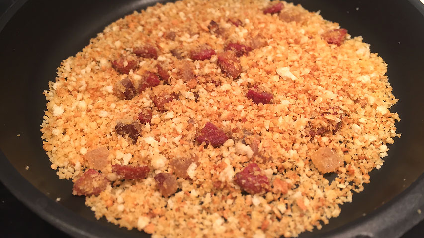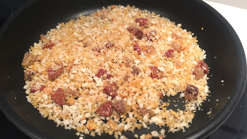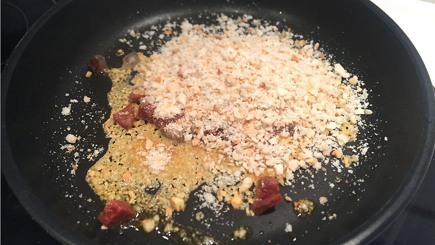Incorpora el pan triturado y no dejes de moverlo durante 3 minutos. Debe quedar dorado y algo crujiente.