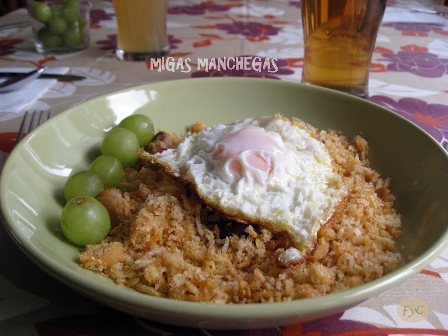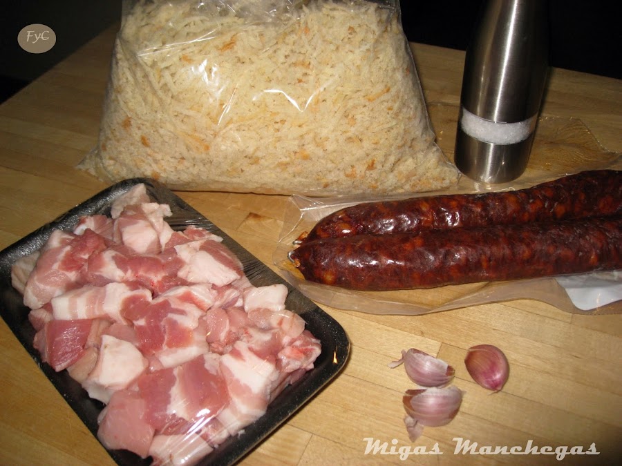 1 pan redondo, que lo habremos dejado asentar un par de días (ahora en cualquier supermercado podemos encontrar las migas ya cortadas, listas para preparar), 4 dientes de ajo, 1 chorizo de sarta de buena calidad, 250-300 gr. panceta fresca, 1 huevo frito por persona, uvas, sal, AOVE. Yo suelo hacerlas con estos ingredientes pero mi madre pone algunas veces pimiento verde frito, boquerones fritos... a vuestra elección.
