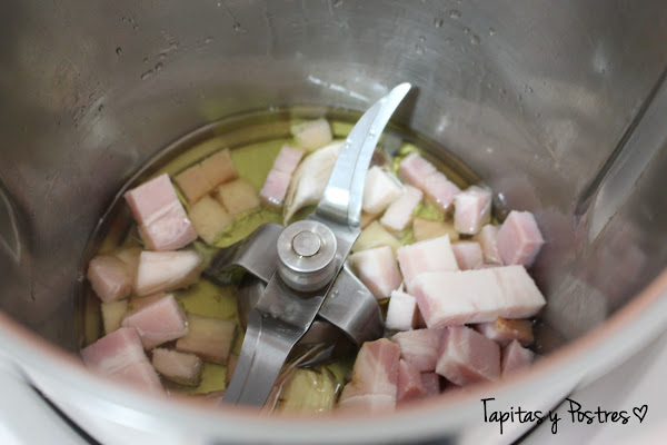 Agregamos el bacon o la panceta en trocitos y rehogamos durante 5 minutos, temperatura varoma giro a la izquierda y velocidad cuchara.
