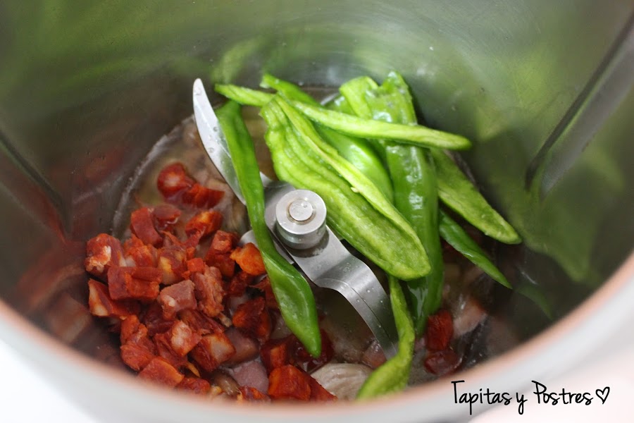 Añadimos el chorizo en taquitos y el pimiento lavado, sin semillas y a tiras y volvemos a freír durante 7 minutos, temperatura varoma, giro a la izquierda y velocidad cuchara.