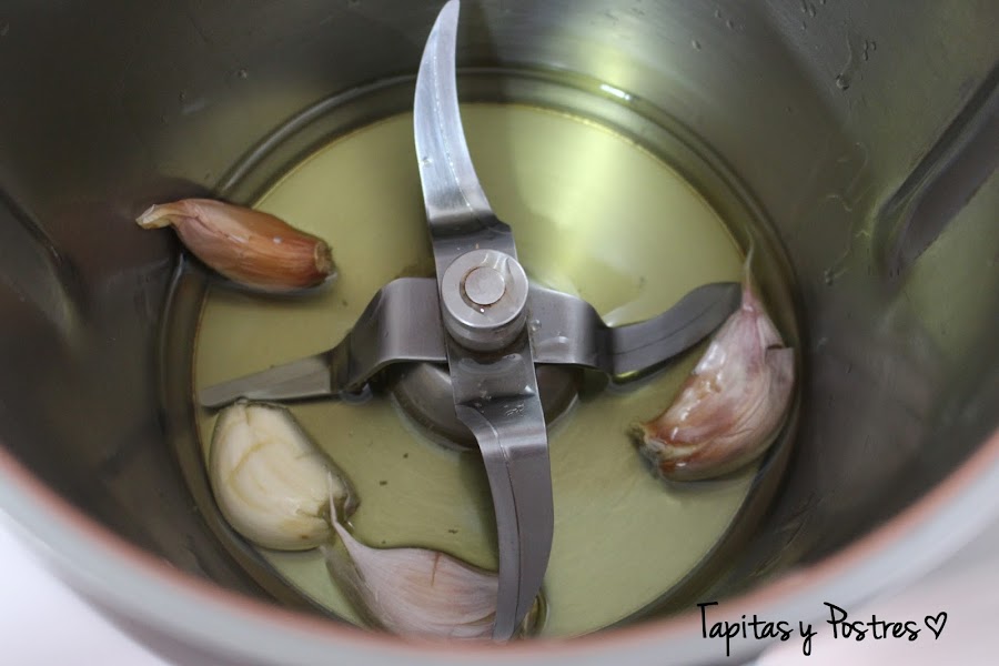 Al acabar añadimos los dientes de ajo a los que habremos hecho un corte sin llegar hasta el final, y freímos 5 minutos, varoma, velocidad 1.