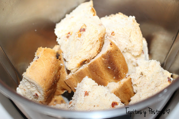 Troceamos el pan y lo desmigamos en el vaso de la thermomix 5 segundos a velocidad 5.Reservamos aparte.