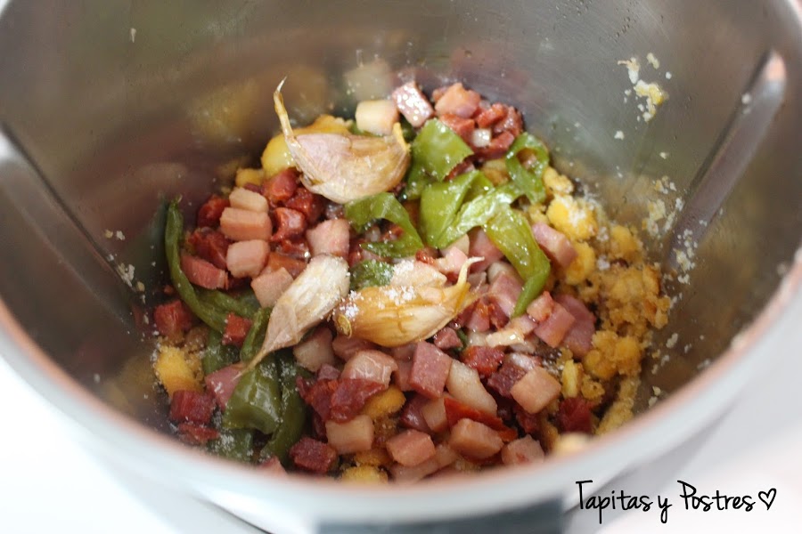 Al acabar, sazonamos con sal y pimienta al gusto y añadimos el bacon, los ajos, el chorizo y el pimiento que teníamos reservado. Removemos 10 segundos con giro a la izquierda y velocidad cuchara y servimos acompañadas de unas uvas y aceitunas aloreñas.