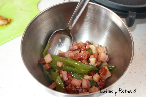 Ahora incorporamos el chorizo y el pimiento.