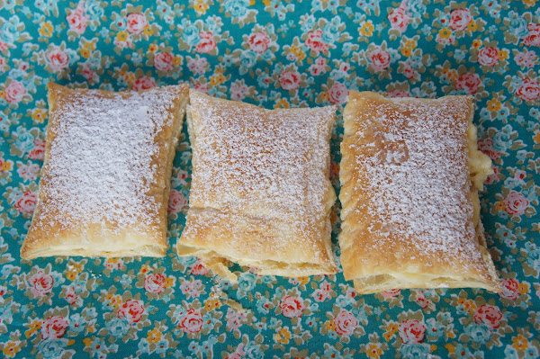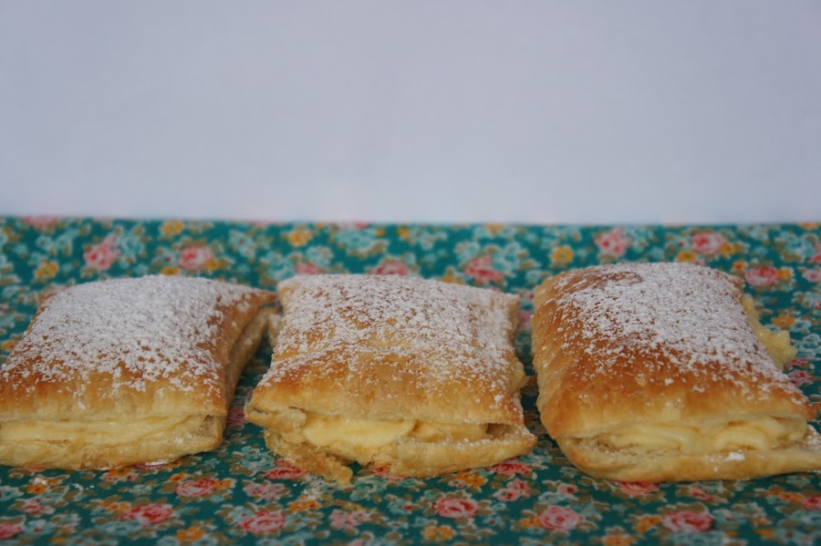 Abrimos los cuadraditos de hojaldre por la mitad, los rellenamos de crema y espolvoreamos por encima con azúcar glas. Guardamos en la nevera y los sacamos sobre 10 minutos antes de consumir para que no esté muy fría la crema.