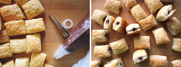 Para rellenarlos podemos utilizar una manga pastelera con una boquilla de relleno. En este caso la crema de chocolate tiene que estar un poco fluida para que no tapone la punta. Introducimos la boquilla por uno de los lados cortos del hojaldre y presionamos hasta que la propia crema expulse la boquilla del interior. Si no tienes manga, puedes abrir los hojaldres, añadir el relleno con una cucharilla y volver a colocar la parte superior.