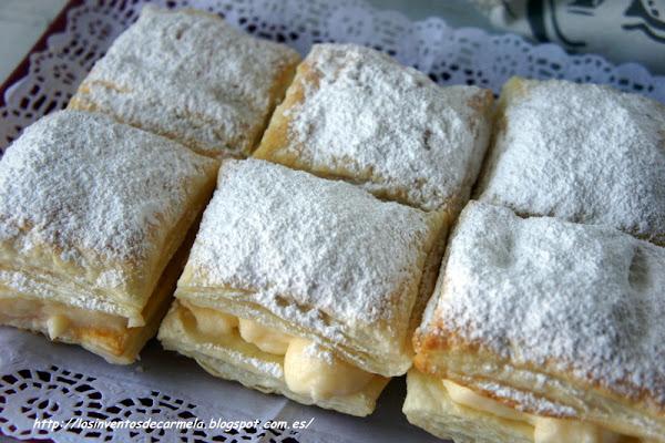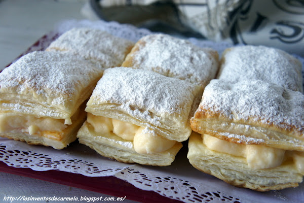 Es un dulce típico de La Roda, en Albacete, en el período de la feria donde por lo visto, se venden a miles jeje y es que no me extraña, pues son un bocado exquisito y si compráis un buen hojaldre, lo demás viene solo. La receta la he tomado del blog Velocidad Cuchara, ya que los he preparado con la thermomix, pero, los mismos pasos se hacen con el método tradicional, no reviste dificultad.