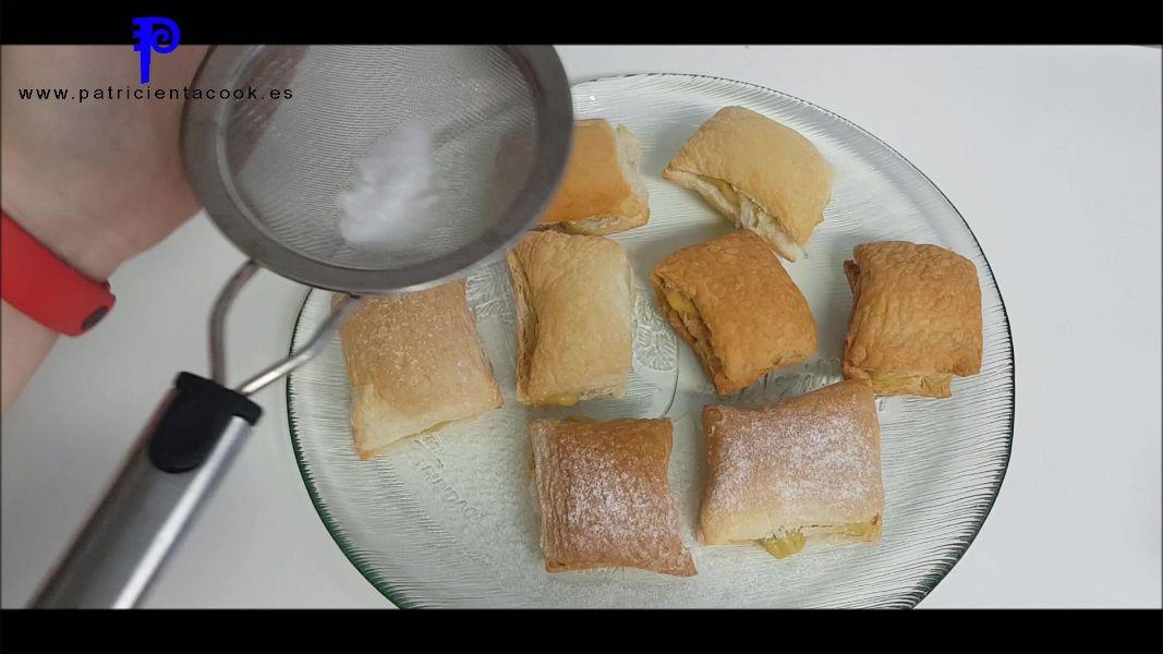 7. Ya solo nos queda poner la crema pastelera en una manga y partir cada hojaldre a la mitad, rellenando el interior con la cantidad que más nos guste de crema pastelera.