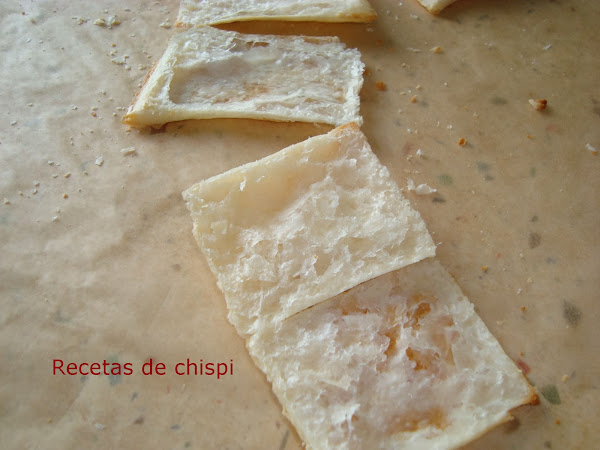 Colocar el hojaldre sobre un papel de horno o si se quiere dejarlo sobre el mismo papel en el que viene y cortar en rectangulos del tamaño que se quiera y hornear en horno precalentado a 200º durante10-15 minutos.