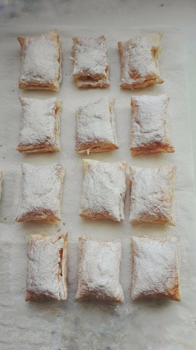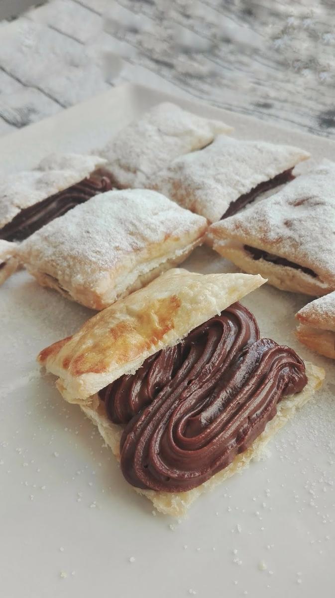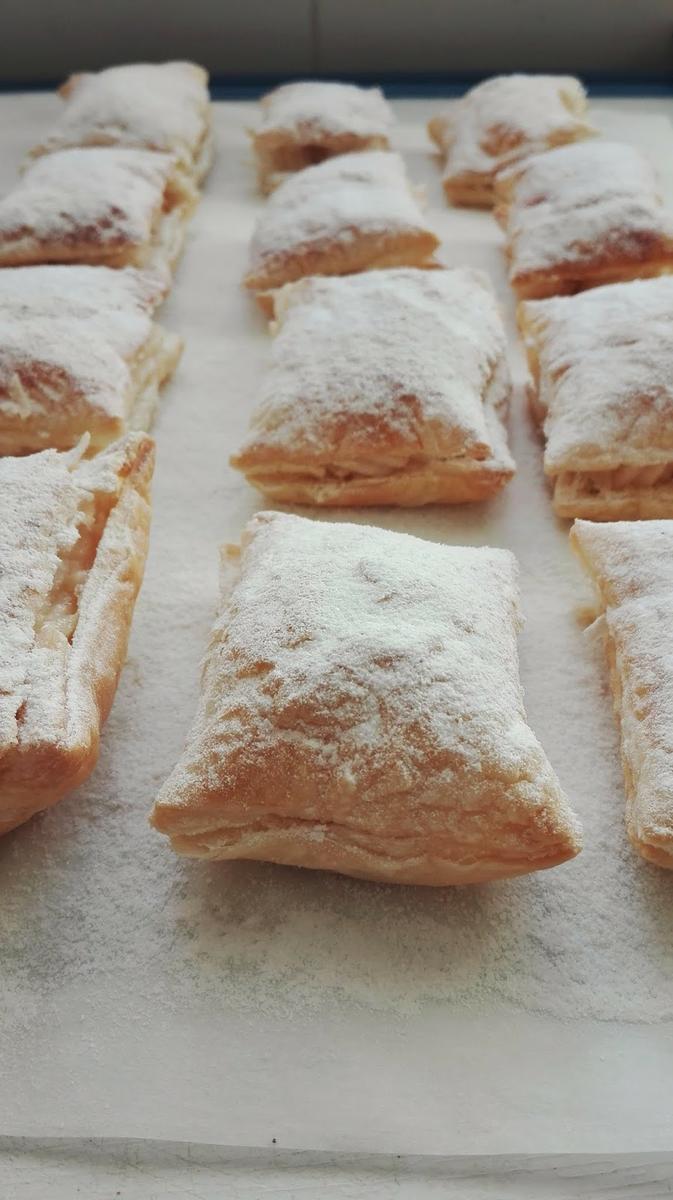 Con un cuchillo afilado cortamos cada uno por la mitad, cubrimos con crema la parte inferior y tapamos con la parte superior del hojaldre.