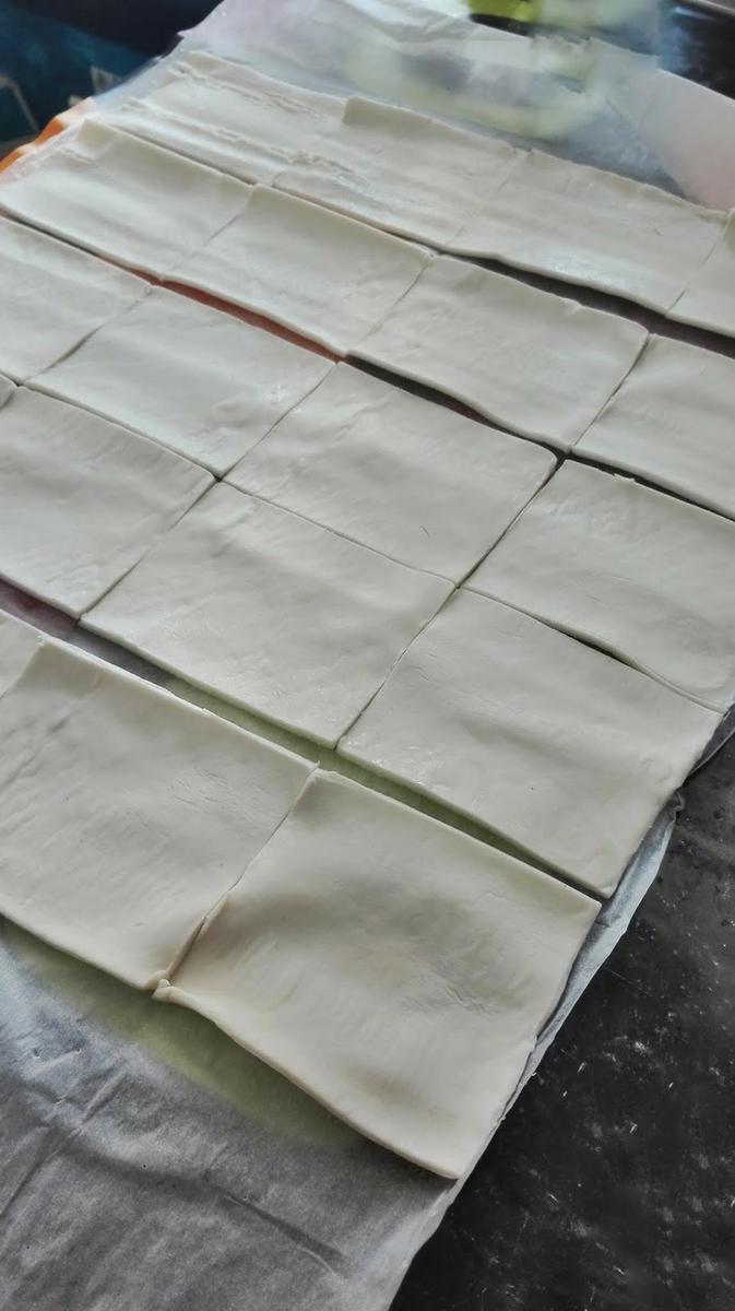 Desenrollamos la masa de hojaldre y cortamos en porciones cuadradas con un cuchillo afilado