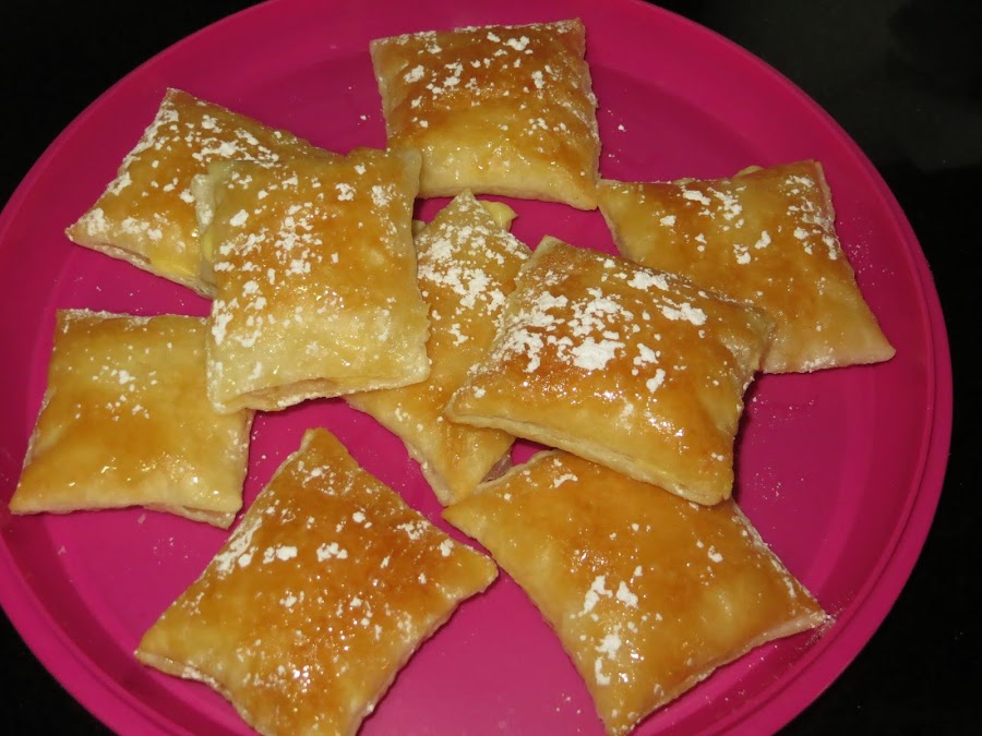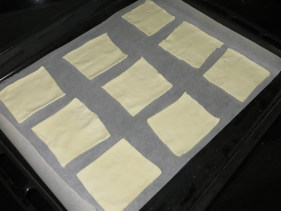 Lo primero que hacemos es la crema pastelera y la dejamos enfriar en la nevera. Ahora cogemos nuestra masa de hojaldre la estiramos y la cortamos en rectángulos, si es cuadrada os saldrán de 12 a 16 miguelitos si es redonda realizarla cuadrada y os saldrán unos 9.