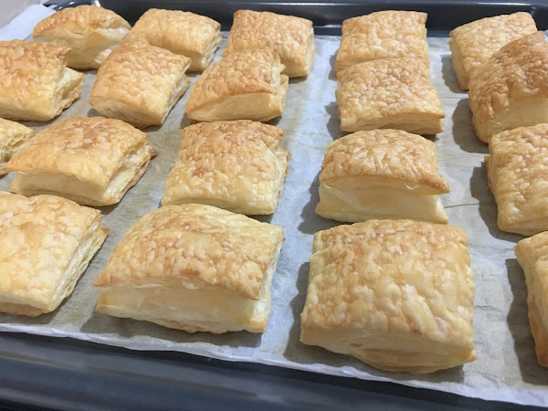 Precalienta el horno a 200º. Extiende la lámina de hojaldre sobre una bandeja con papel de hornear y córtala a cuadrados. Hornéala hasta que suba el hojaldre y esté ligeramente dorado (unos -12 min. aprox.) Sácala y déjala enfriar sobre una rejilla.