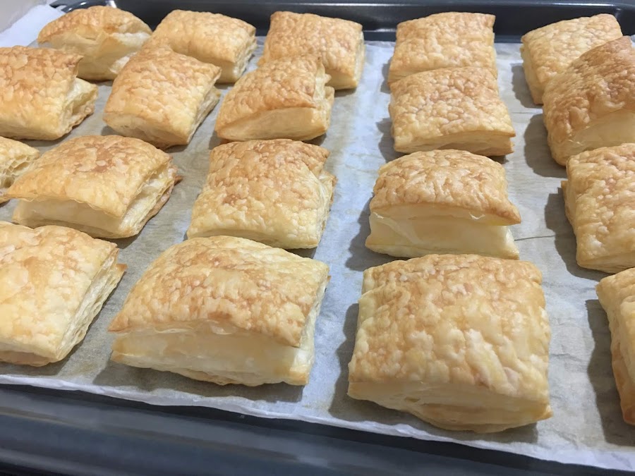 Una vez enfriado el hojaldre ábrelos por la mitad con un cuchillo sin sierra para rellenarlos.