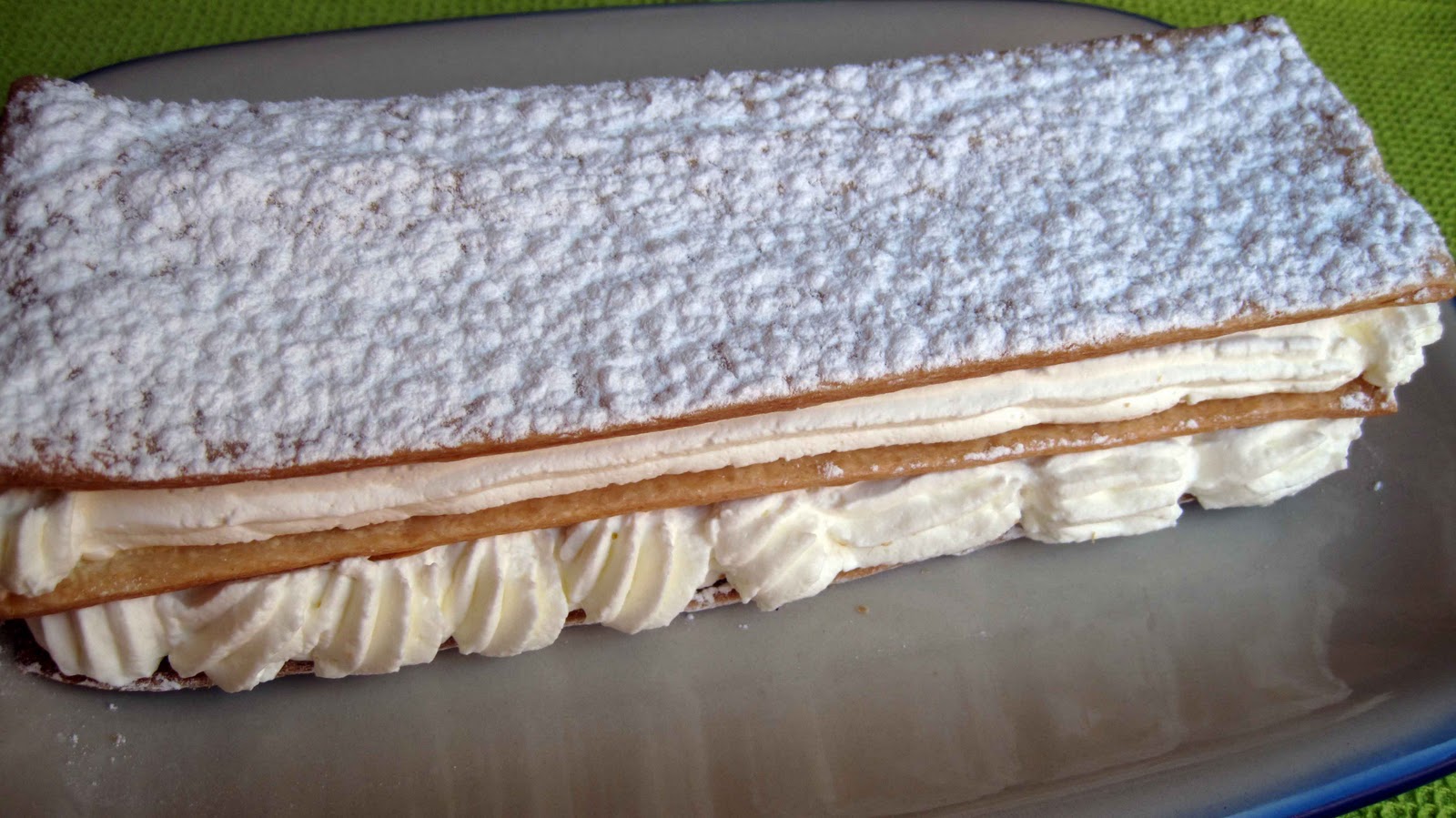 Primero una plancha de hojaldre, luego una buena capa de nata (crema de leche), otra de hojaldre, otra de nata (crema de leche) y por último la última plancha de hojaldre que quedaba y le ponemos bien de azúcar glasé por encima.
