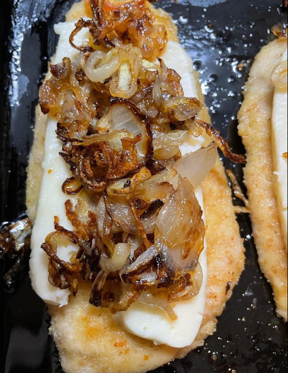 Hice estas milanesas a la fugazzeta, pero con la cebolla caramelizada y quedo super rica, es una variante ya que en realidad, cuando es la la fugazzeta la cebolla se pone cruda y luego al horno, pero me dí el permiso de hacerla así y probar otros sabores.es fugazza o fugazzeta , me dijo una amiga
