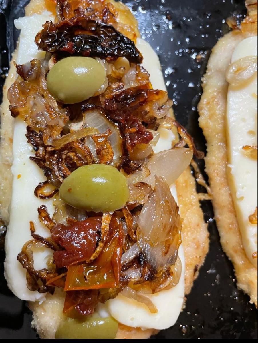 Pasos 4Llevar a horno fuerte hasta que se doren de ambos lados, al dar vuelta agregar cebolla cortada en juliana y queso matecoso.