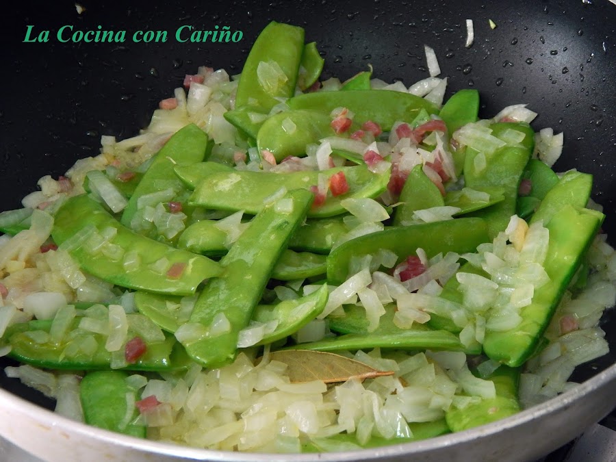 Pondremos en otra sartén 3 cucharadas de aceite de oliva virgen extra a fuego medio y cuando esté caliente añadimos los ajos. Al dar olor, ponemos la cebolla con un poco de sal para que sude. Vamos moviendo y cuando esté transparente la cebolla, añadimos los tirabeques y el jamón. Salpimentamos y salteamos unos minutos. Reservamos.