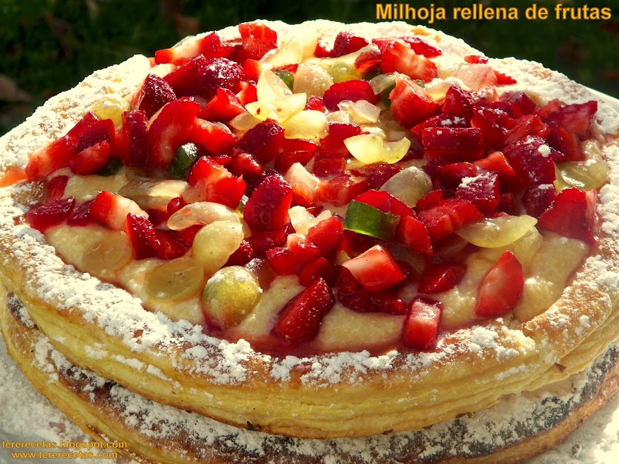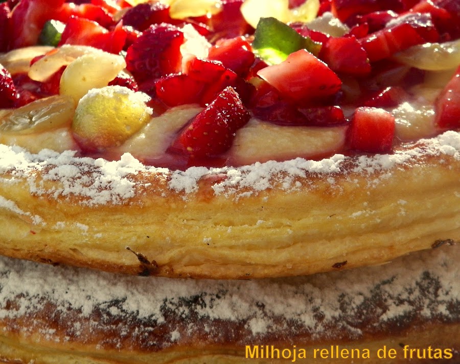 Aquí te le presento rellena de frutas y con una capa de crema pastelera y otra de nata montada (crema de leche), es deliciosa!!!!