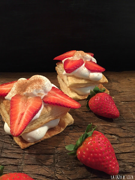 Se rellenan las hojas de hojaldre (deben estar ya frías) y se decora como más os guste. Colocar unas fresas laminadas por encima y añadirle un poco más de merengue y espolvorear con canela en polvo para terminar la decoración, os recomiendo hacerlo encima de un pequeño colador de malla fina, por lo que pudiese pasar.