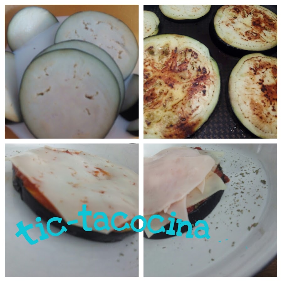 Colocar en recipientes individuales una rodaja de berenjena sobre ella una cucharada de tomate y un poco de orégano, seguir haciendo capas con el queso y el jamón y vuelta a empezar con otra rodaja de berenjena asada, tomate, orégano, queso y jamón, terminando con una berenjena espolvoreada con queso en polvo.