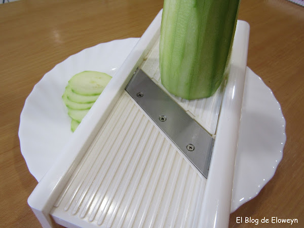Aquí podéis ver lo finas que son las rodajas de calabacín acabadas de cortar con la mandolina.