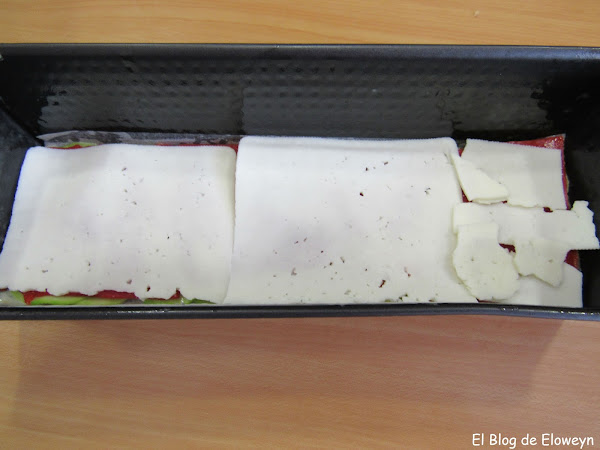 Una vez puestas las lonchas de jamón de York ya hemos completado el primer piso. Repetimos la operación. Vamos poniendo una capa de rodajas de calabacín con un poquitín de sal, otra de pimientos del piquillo, otra de queso y otra de jamón york. Así hasta agotar las existencias.