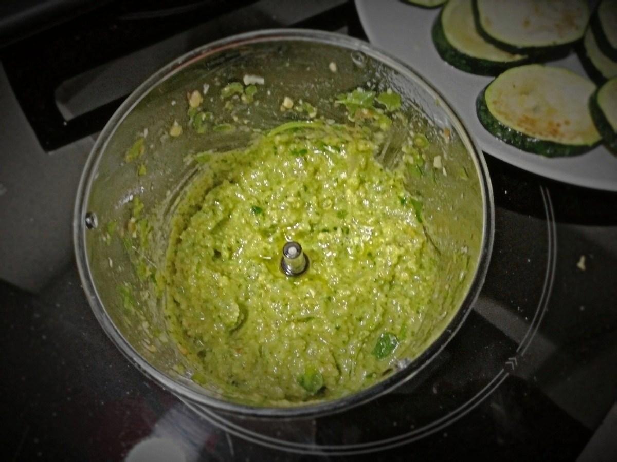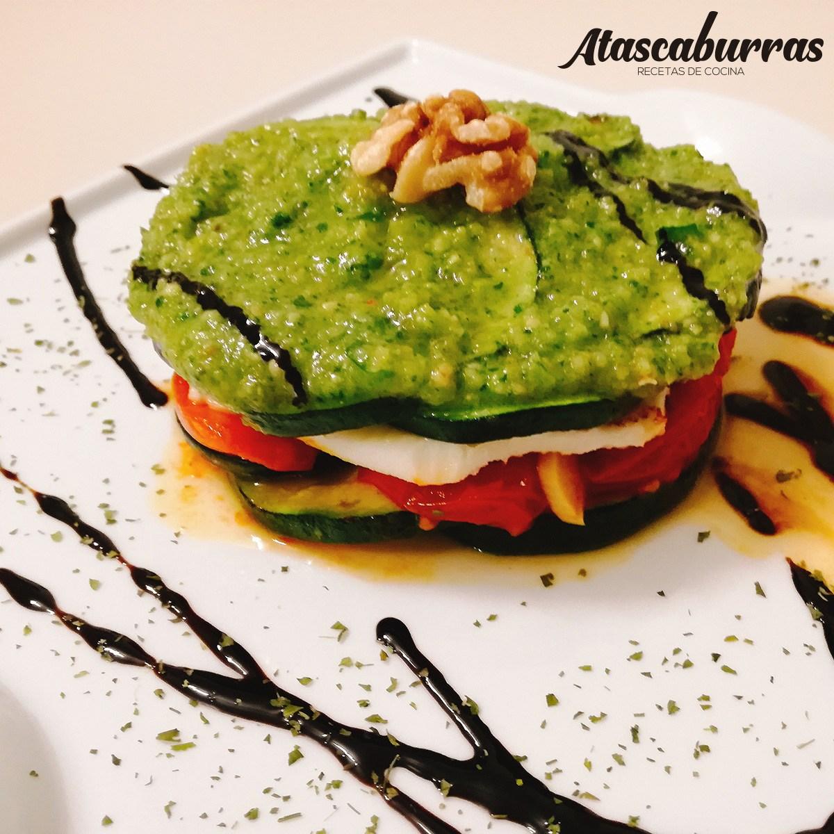 Ahora toca rematar el plato. Para ello, echamos el pesto por encima de la última capa de calabacín y repartimos.
