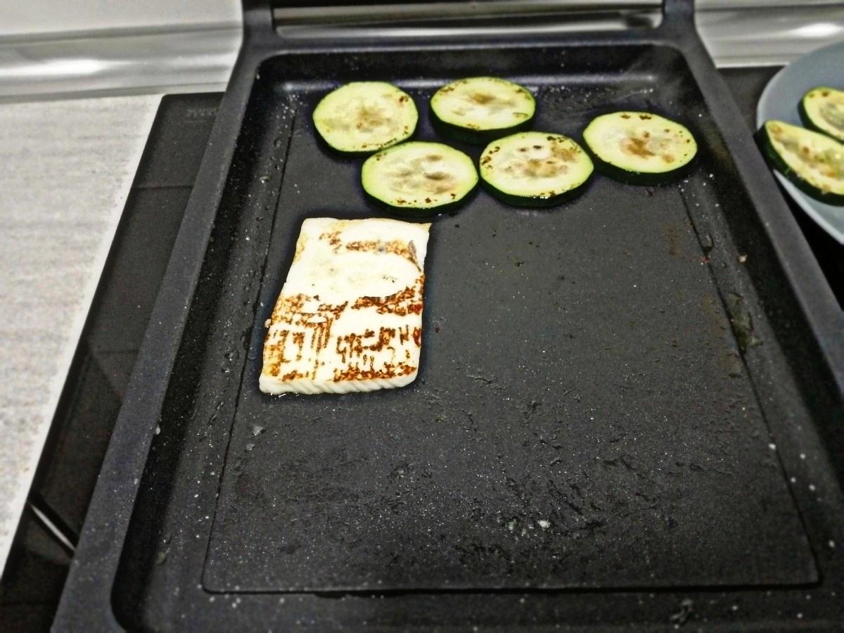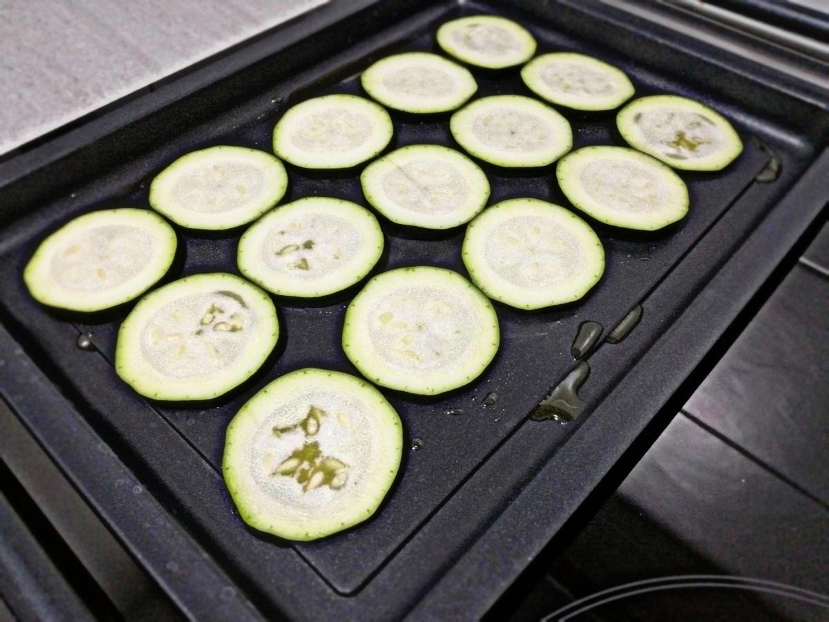 Hacemos a la plancha con un poco de aceite las rodajas de calabacín. Hasta que estén un poco doradas, y por ambos lados.