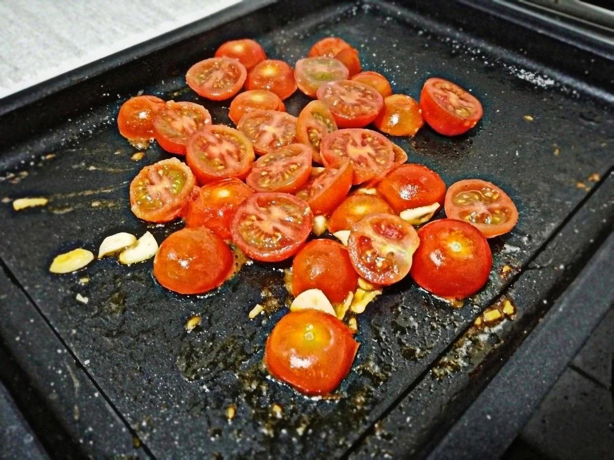Añadimos los tomates cherrys cortados por la mitad y sofreímos junto con los ajos.