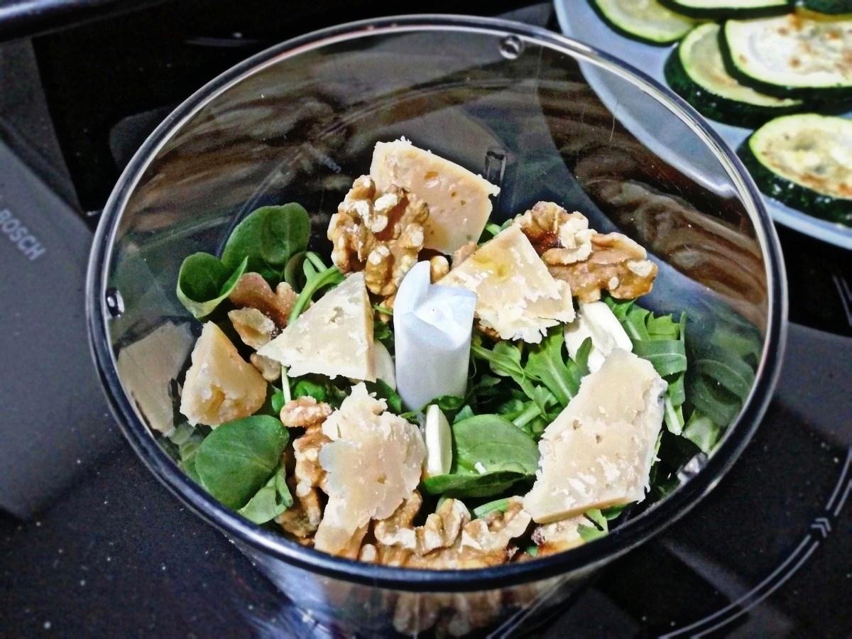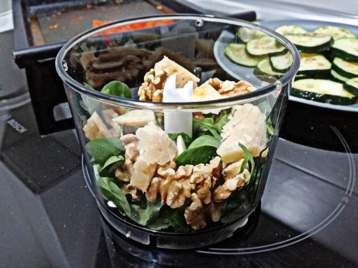 Hacemos el pesto de rúcula. Para ello ponemos un puñado de rúcula, otro puñado de nueces, un ajo sin su corazón, y 4 ó 5 cucharadas de aceite de oliva en la picadora ó vaso de la batidora. Trituramos todo hasta que se forme una pasta. Reservamos.