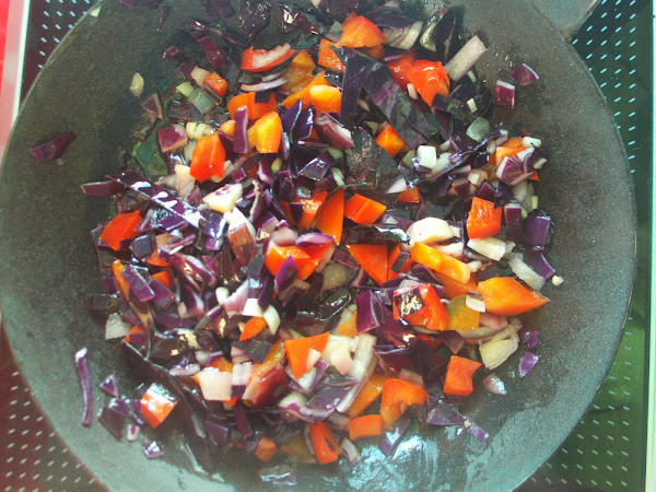 Picamos la col, la cebolla, el pimiento rojo y el ajo y las sofreímos
