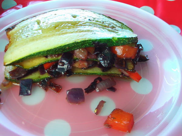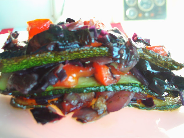 Montamos: 1 lámina de calabacín, el sofrito de verdura, 1 lámina de calabacín y sofrito de verdura, otro piso si queremos.