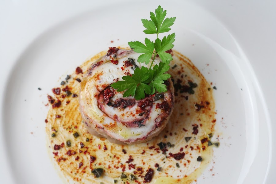 Es importante que usemos pulpo sin cocer para esta receta, pues lo vamos a embotellar para poder elaborar el carpaccio. La técnica del embotellado se usa en Italia para elaborar carpaccio de pulpo y consiste en, una vez cocido el pulpo, meterlo en una botella de plástico y dejarlo enfriar para que quede de una forma cilíndrica al enfriarse las gelatinas que suelta el pulpo y poder así cortarlo de forma muy fina. Podéis ver cómo se hace en el siguiente link:http://www.la7.it/cuochi-e-fiamme/video/soppressa-di-polpo-o-carpaccio-di-polpo-in-bottiglia-25-05-2015-155765.
