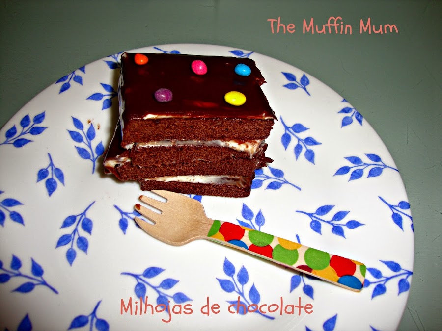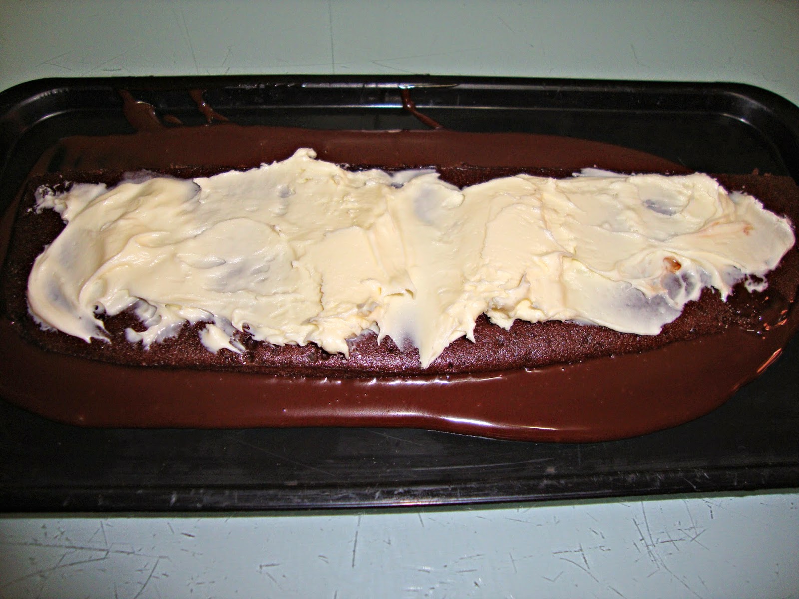 Cortamos el bizcocho en trozos de 5-7 cm de ancho y vamos poniendo una capa de bizcocho y en mi caso luego una capa de frosting de vainilla y de ganache de chocolate y luego otra de bizcocho hasta poner la ultima capa y luego lo he bañado en ganache de chocolate.