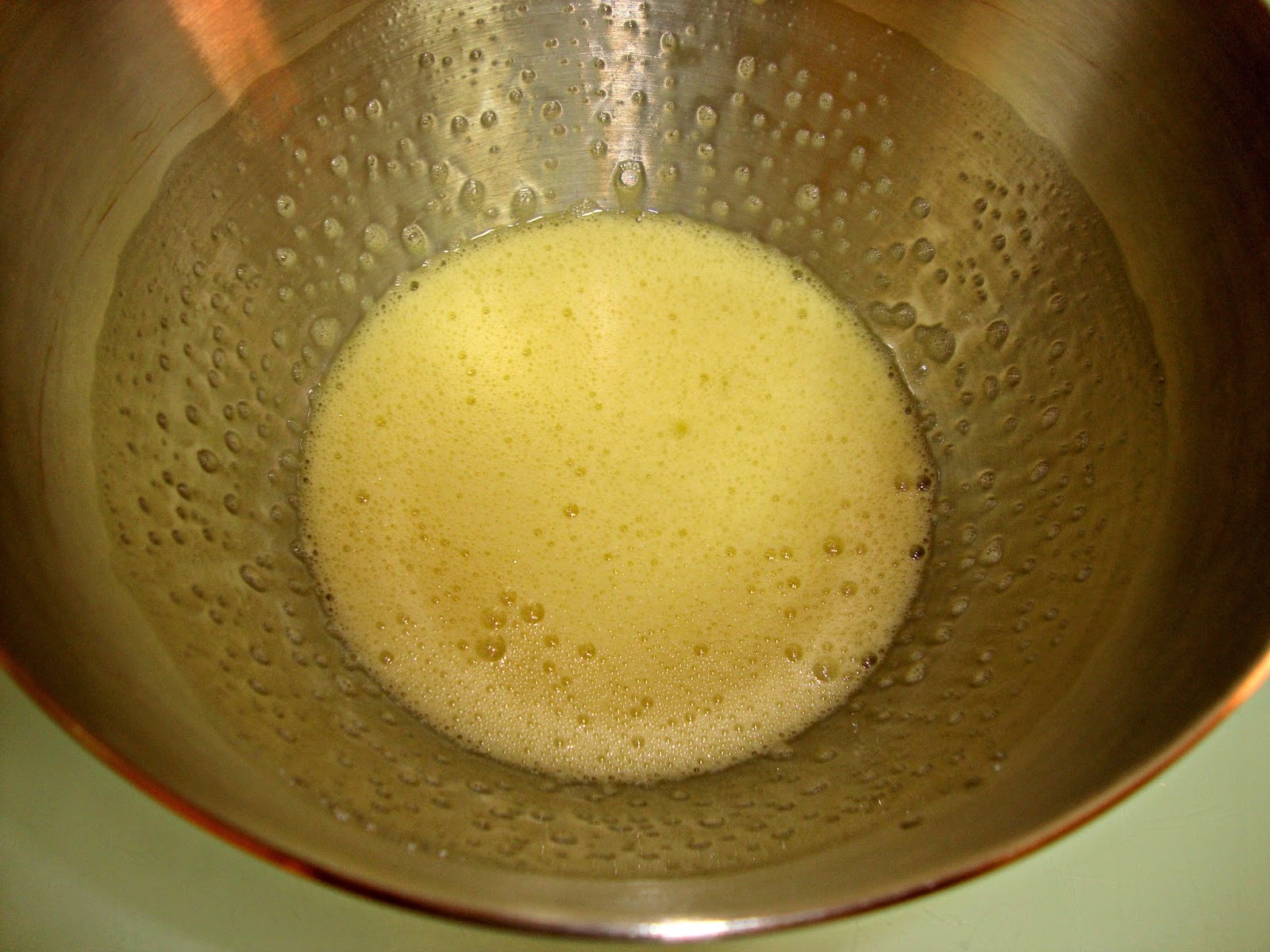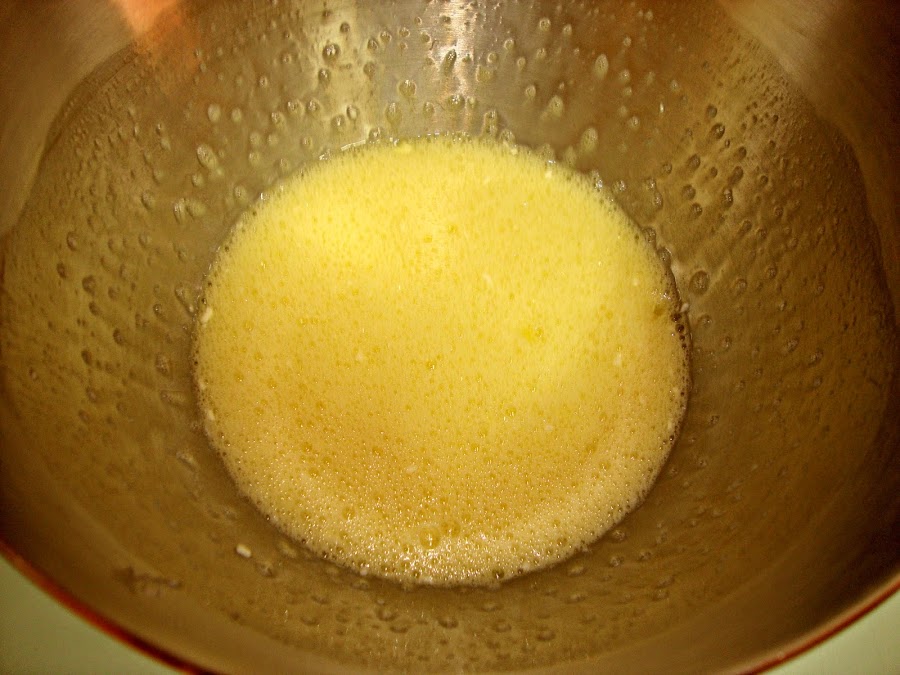 Ponemos en un bol los huevos y los batimos mientras espolvoreamos el azúcar por encima hasta que tripliquen su volumen ( entre 5 y 10 minutos), luego le añadimos poco a poco trocitos de mantequilla.