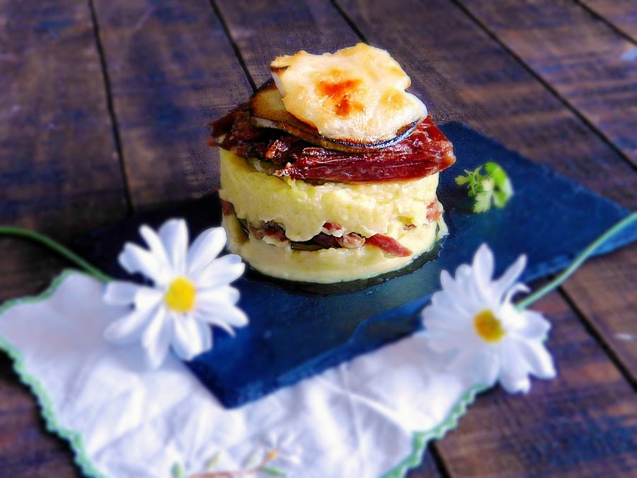Vamos a emplatar. Colocar con un aro de emplatar una base de parmentier de patata. Sobre la patata colocar una rodaja de manzana, un trozo de foie y el confit de pato desmenuzado. Cubrir con otra capa de parmentier de patata, otro trozo de foie, un poco más de confit de pato y una rodaja de manzana. Coronar con un medallón de queso de cabra.