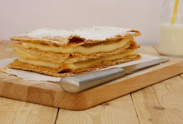 Reconozco que cualquier dulce con hojaldre me chifla y si además es suave y meloso no me puedo resistir.Milhojas de hojaldre relleno con crema