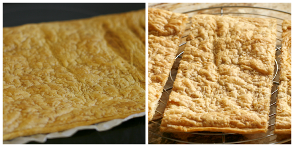 Cuando este cocinado el hojaldre, lo sacas y cortas con un cuchillo para el pan el rectángulo en 3 trozos iguales y dejas enfriar en una rejilla. (segunda imagen de arriba)