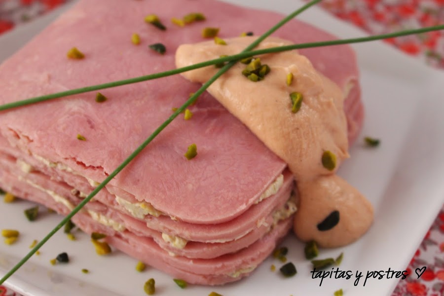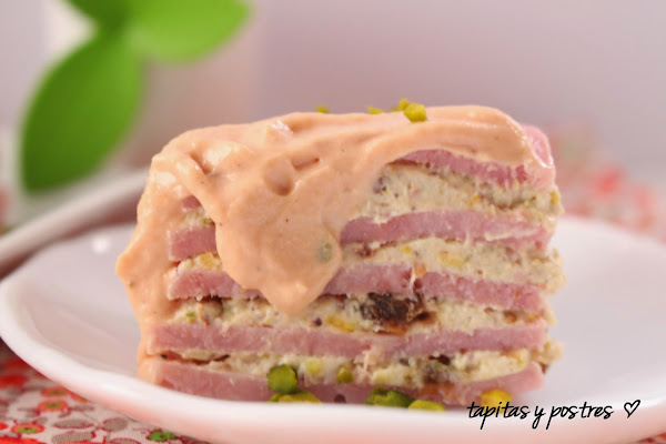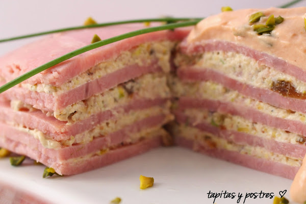 Hoy toca receta salada. Una milhojas de jamón y pistachos buenísima que nos puede servir como entrante o aperitivo, incluso me parece una apuesta muy buena para celebraciones especiales como Navidad.