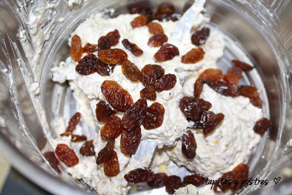 Añadimos las pasas y trituramos 5 segundos a velocidad 8. Deben quedar trozos enteros.