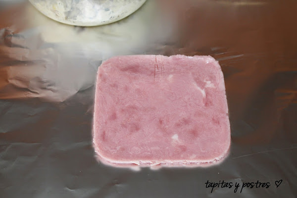 Sobre la encimera, ponemos una hoja grande de papel aluminio y colocamos la primera loncha de jamón.
