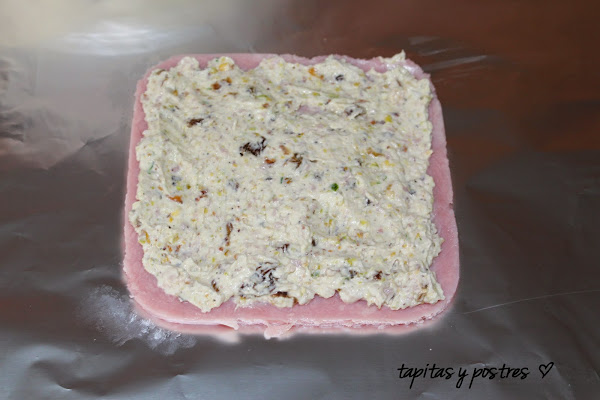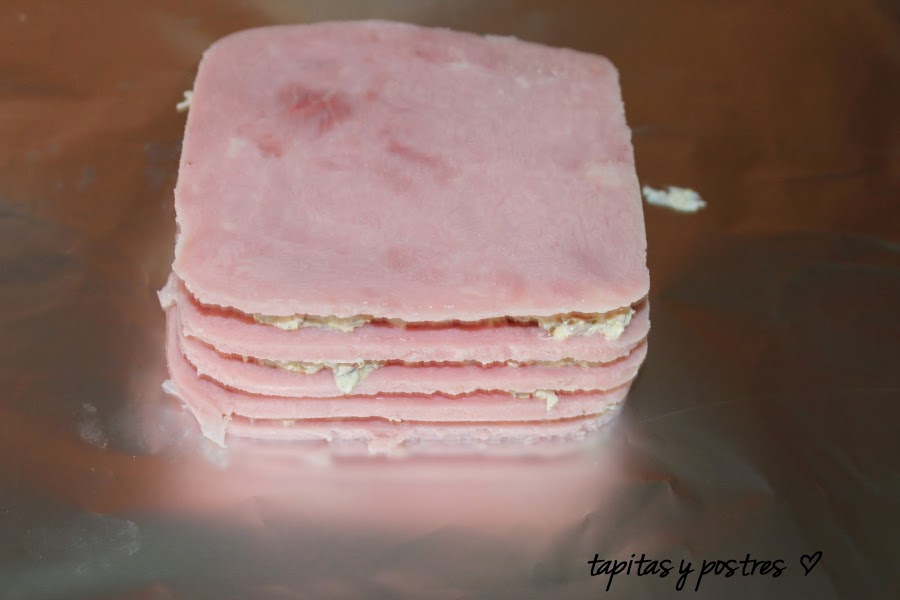 Ponemos una hoja grande de papel de aluminio sobre la encimera y colocamos una de las lonchas de jamón, untamos con la pasta obtenida anteriormente y ponemos otra loncha encima. Hacemos esto hasta acabar con el jamón. Debe quedar una loncha encima del todo.