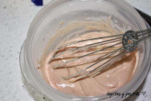 Es una especie de salsa rosa. Si no queréis usar nata (crema de leche), podéis poner queso fresco batido 0%, Será mas light.