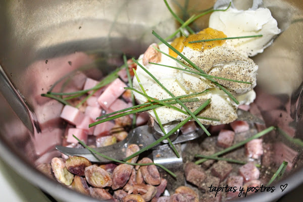 Echamos los pistachos, el jamón a daditos, el queso, la mostaza, el limón, el cebollino y la pimienta y lo trituramos todo. Nos va a quedar una pasta espesa. Si es necesario bajamos los restos de las paredes y trituramos de nuevo, hasta que tenga la consistencia adecuada.