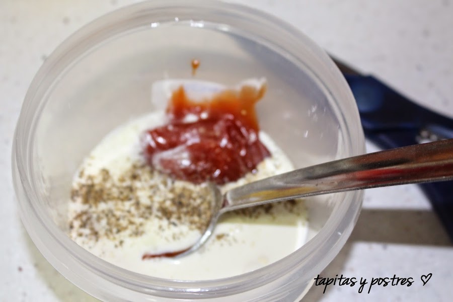 Preparamos la salsa poniendo todos los ingredientes en un bol y batiendo bien hasta obtener una crema espesa. Reservamos.