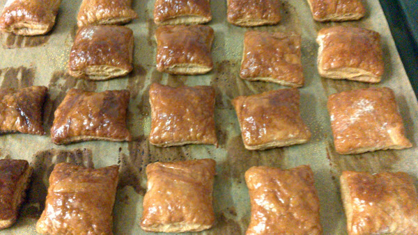 He de admitir que antes de pasar al siguiente paso, algún cuadrado de hojaldre solitario desapareció de la bandeja de "reserva"....