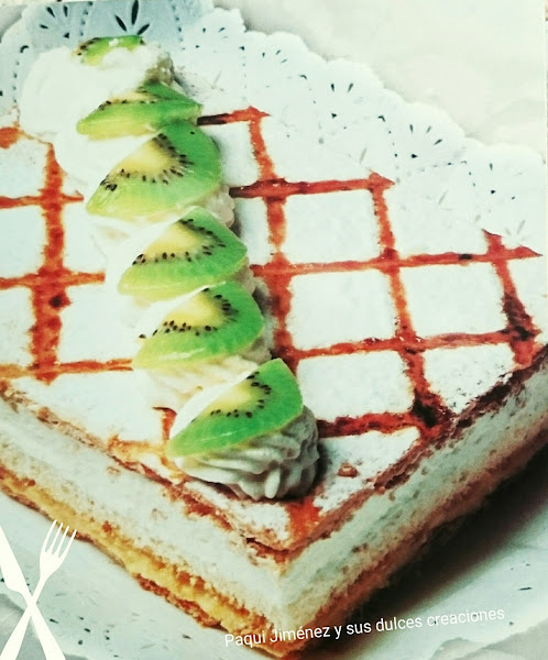 Una vez horneada y fría, colocar una parte del hojaldre en la bandeja donde se va a servir. Cubrir con una capa de nata (crema de leche) y colocar otro hojaldre. Poner una capa fina de nata (crema de leche) y terminamos con una capa de hojaldre.