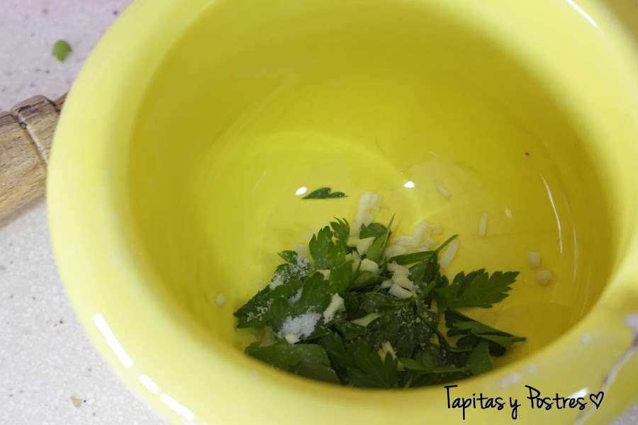 En el mortero vamos a triturar el diente de ajo con la sal y el perejil hasta tener una pasta. Añadimos el aceite y removemos. Reservamos.