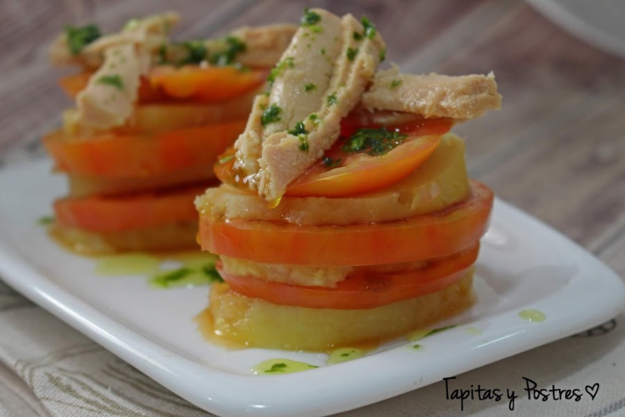 Y después de pasear una y otra vez por su blog, apareció esta Milhojas de patata y tomate que me pareció estupenda para estos días de calor, porque es como una pequeña ensalada en formato mini.